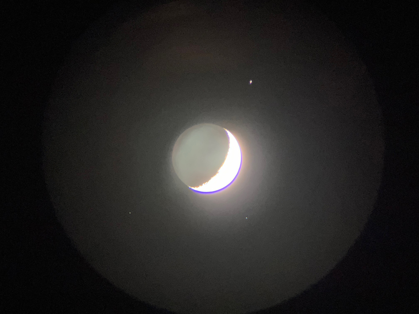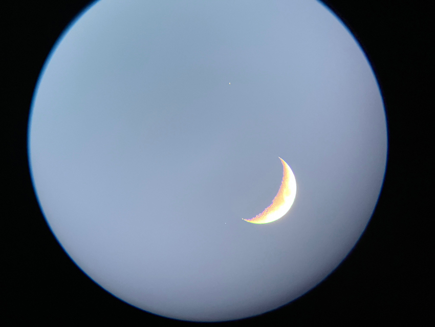 June 29, Moon and Mars. These images were taken by holding an iPhone to my Orion giant view 25×100 binoculars. The Moon is in the center of a triangle made by Mars, Rho Leo and 49 Leo. I watched the Moon glide past Mars that Sunday from 7:30 pm to 10:30 pm. Notice how far the Moon has moved past Rho Leo from the first to the last image. Also 49 Leo is visible in the last two images.
