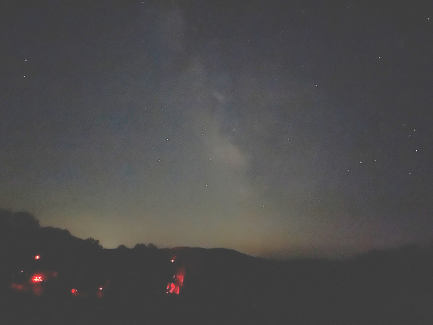 Stellafane. Thursday was okay, and we had a slight wind. Not the best night, but I managed to see 15 of the 20 binocular observing Olympic targets to get my pin. Friday was about the same as Thursday. I set up my Celestron 102az at my campsite. I just couldn’t make the two trips back and forth to the observing hill. I had a good window to see Scorpius and Ophiuchus. I looked at Messier objects in them plus just scanned the area looking at star patterns. I didn’t wait for Sagittarius to move into my viewing window, and called it a night at 11:30. Saturday was hazy, and the night was washed out. While I could see Scorpius, it was all washed out so didn’t really observe that night. Below is a picture I took Thursday night. The brightness and contrast were enhanced to show the Milky Way better.