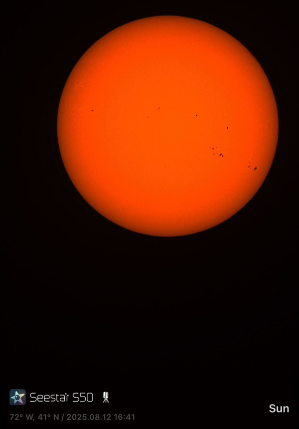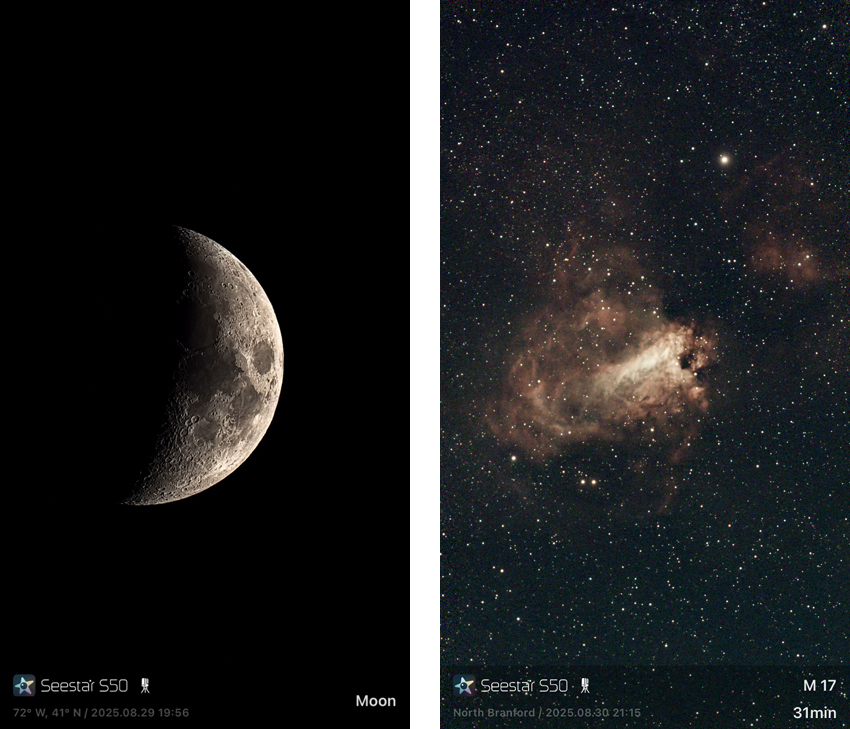 Mike Zarick used his Seestar S50 to capture a lot of sunspots (August 12), the crescent Moon (August 29) and Messier 17, the Swan Nebula (August 30).